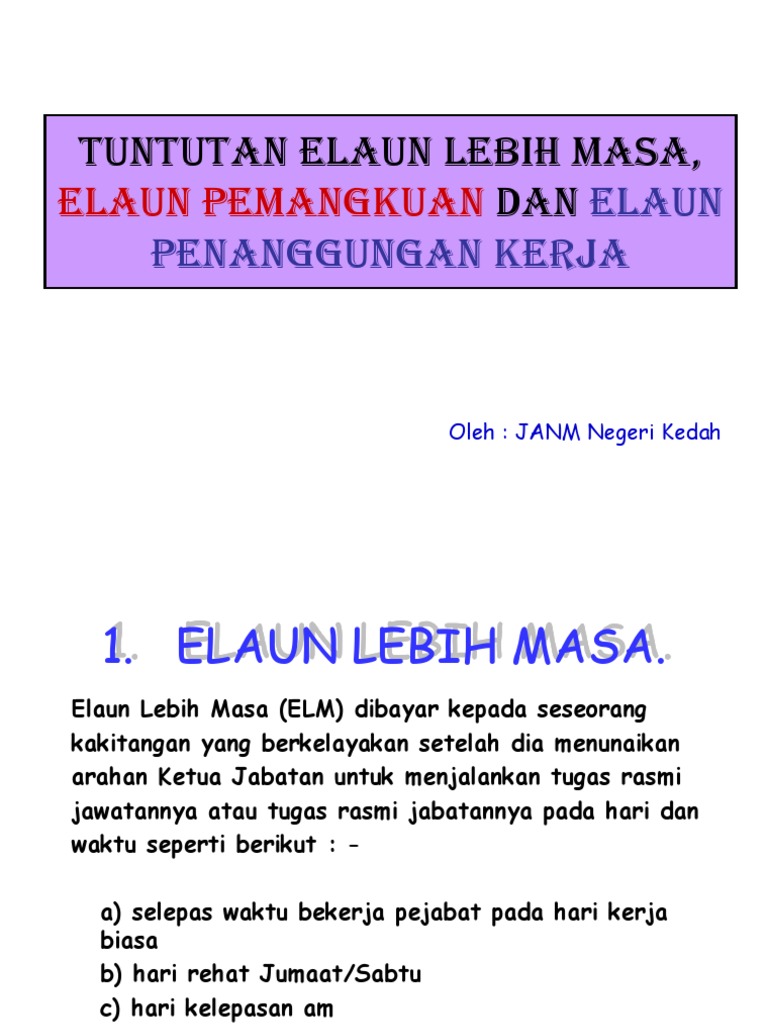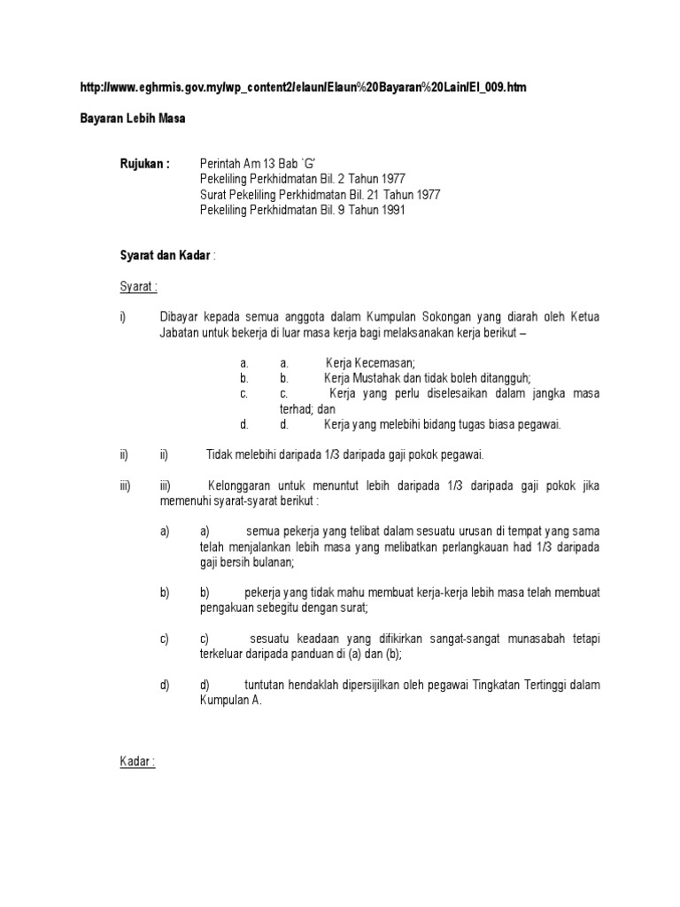 BAYARAN TUNTUTAN PERJALANAN KERJA LEBIH MASA PEJABAT TARIKH KEMASKINI. ELAUN KEMUDAHAN DAN BAYARAN KERANA MENJALANKAN TUGAS RASMI DALAM NEGERI ix Elaun Basikal dan Elaun Motosikal TUJUAN. Kerja lebih masa merupakan kerja-kerja rasmihakiki seseorang pegawai atau Jabatan yang dijalankan atas arahan Ketua Jabatan di luar waktu bekerja biasa yang telah ditetapkan pada Hari Rehat Mingguan Hari Kelepasan Mingguan atau pada Hari Kelepasan Am.